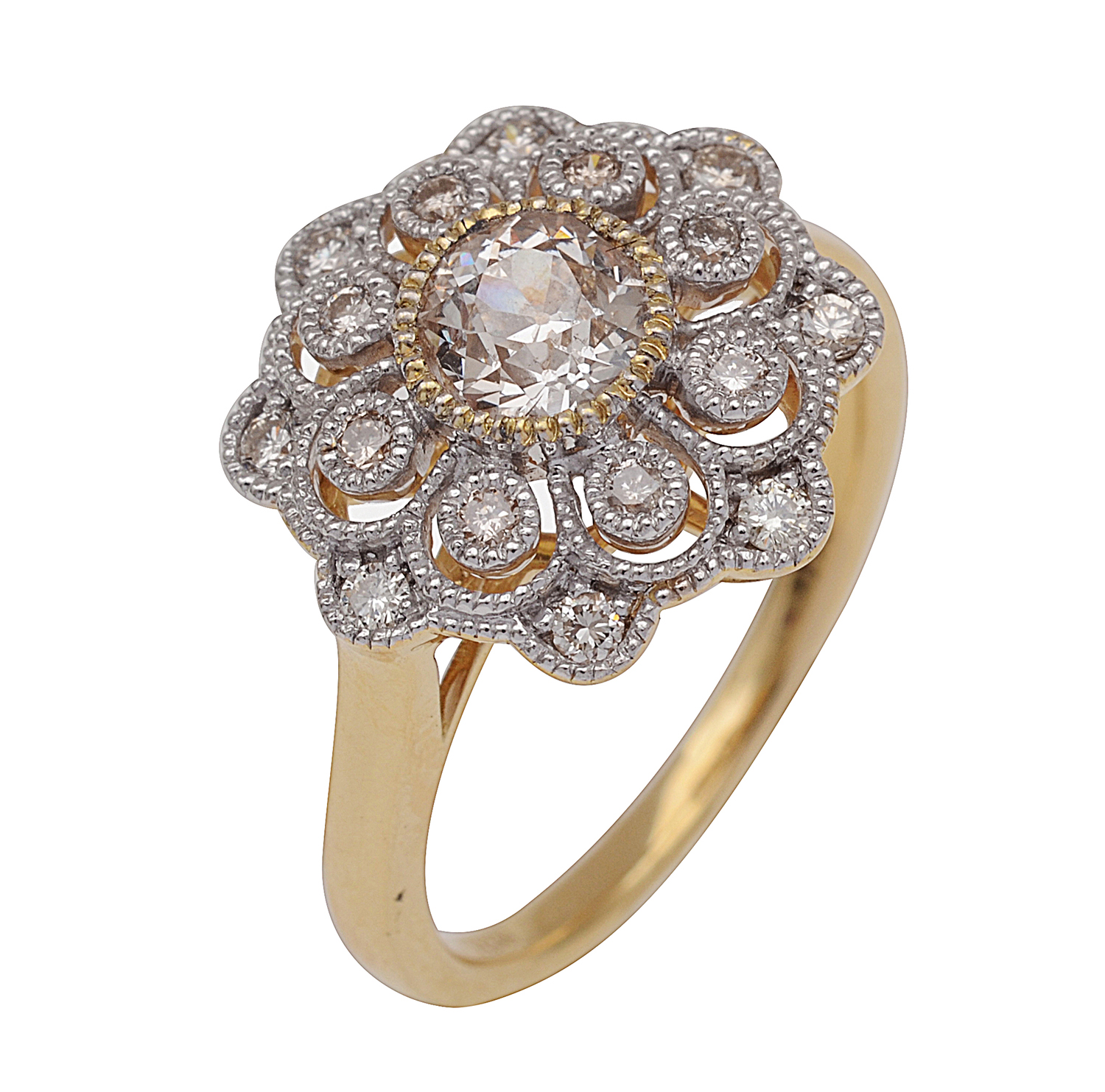 The finely pierced frame featuring an old European cut diamond of 0.65cts surrounded by further diamond detail, all grain set, mounted in 18ct two tone gold, ring size N.