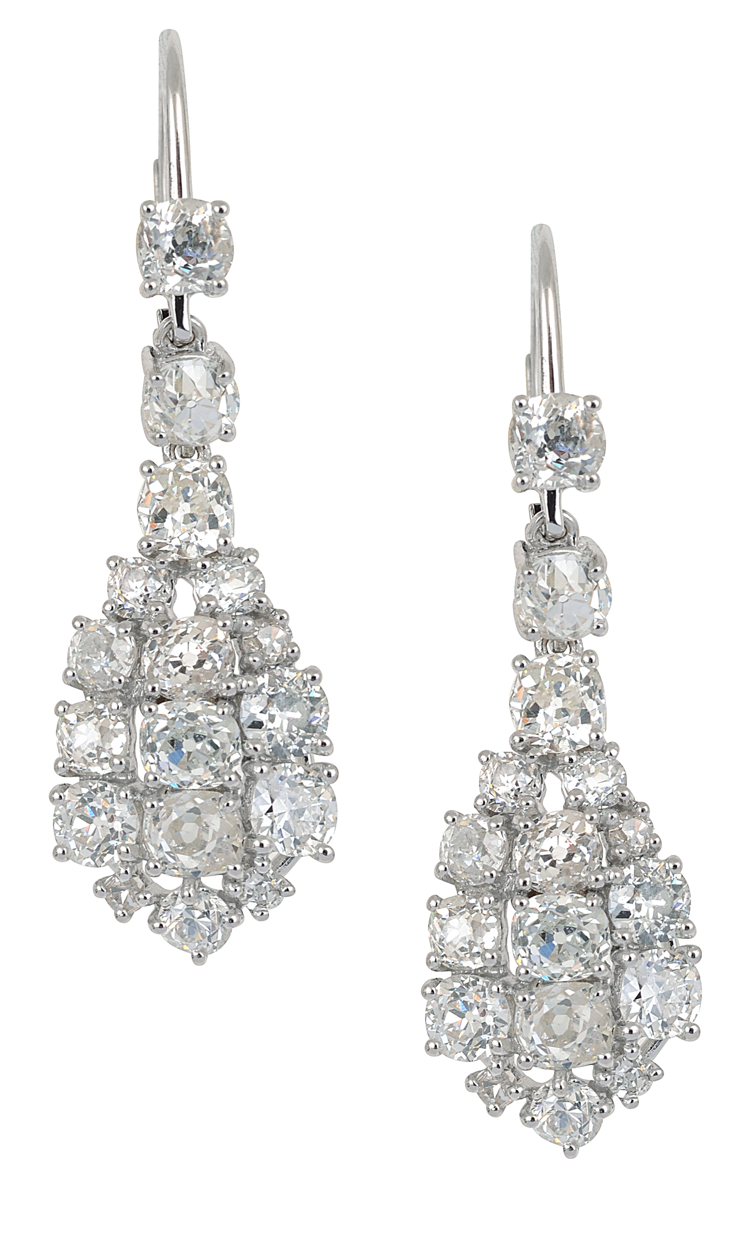 Each earring of tear drop shape set with seventeen old European cut diamonds totalling 3.95cts, mounted in 18ct white gold.