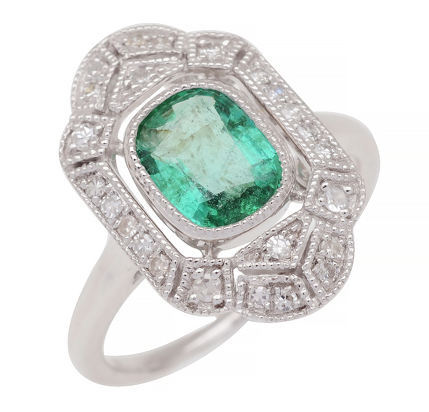The pierced plaque set with an oval cut emerald of 1.47cts, surrounded by grain set single cut diamonds, mounted in 18ct white gold, ring size N.