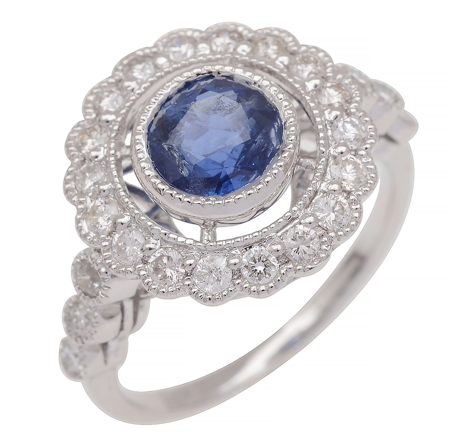 Ring presents in very good condition and stones are secure in their setting. Sapphire has a small surface reaching fracture at the edge of the table. Diamonds are colour G, clarity VS