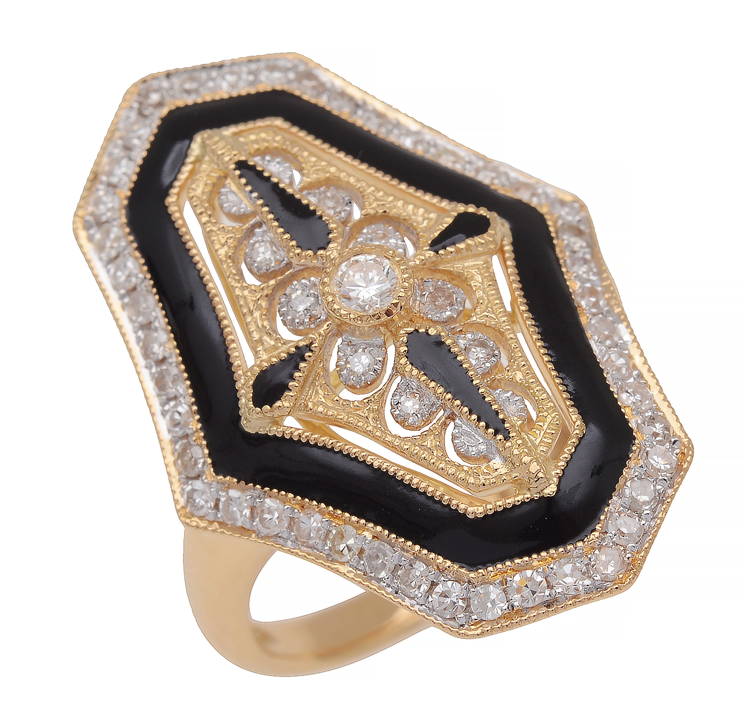 The cartouche shaped plaque set with round brilliant and single cut diamonds and highlighted by black enamel, mounted in 18ct gold.