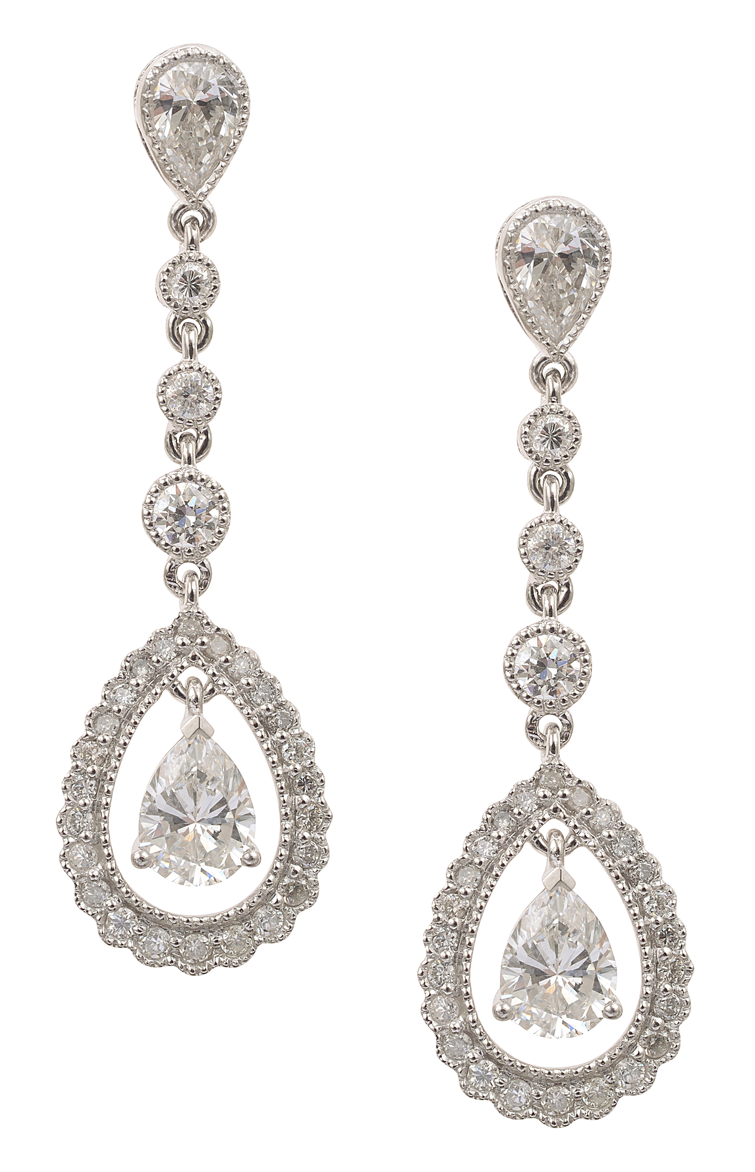 Earrings present in as new condition and stones are secure in their settings. Pear cut diamonds are colour G-H, clarity VS. Round brilliant cut diamonds total 0.34cts colour H, clarity VS-SI. Earrings are 35mm long.