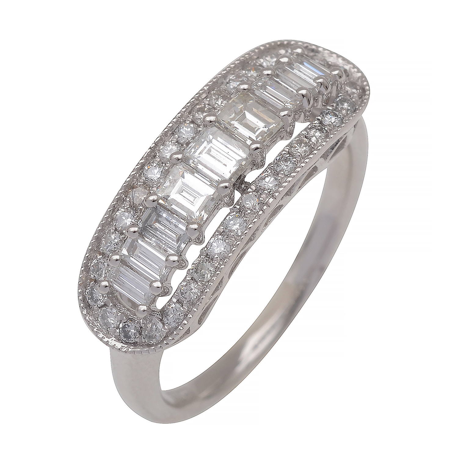 The pierced plaque featuring a row of nine emerald cut diamonds totalling 1.00cts, surrounded by round brilliant cut diamonds, mounted in 18ct white gold, ring size M.