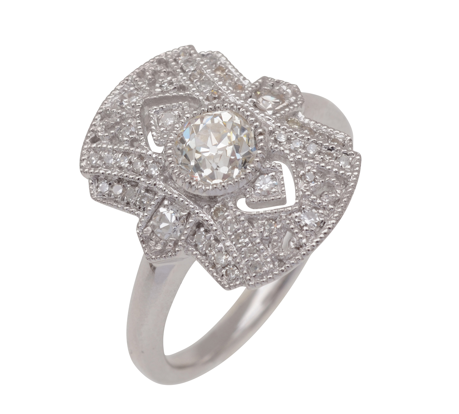 The pierced plaque centrally set with an old European cut diamond of 0.65cts, set throughout with further diamonds, mounted in 18ct white gold, ring size M.