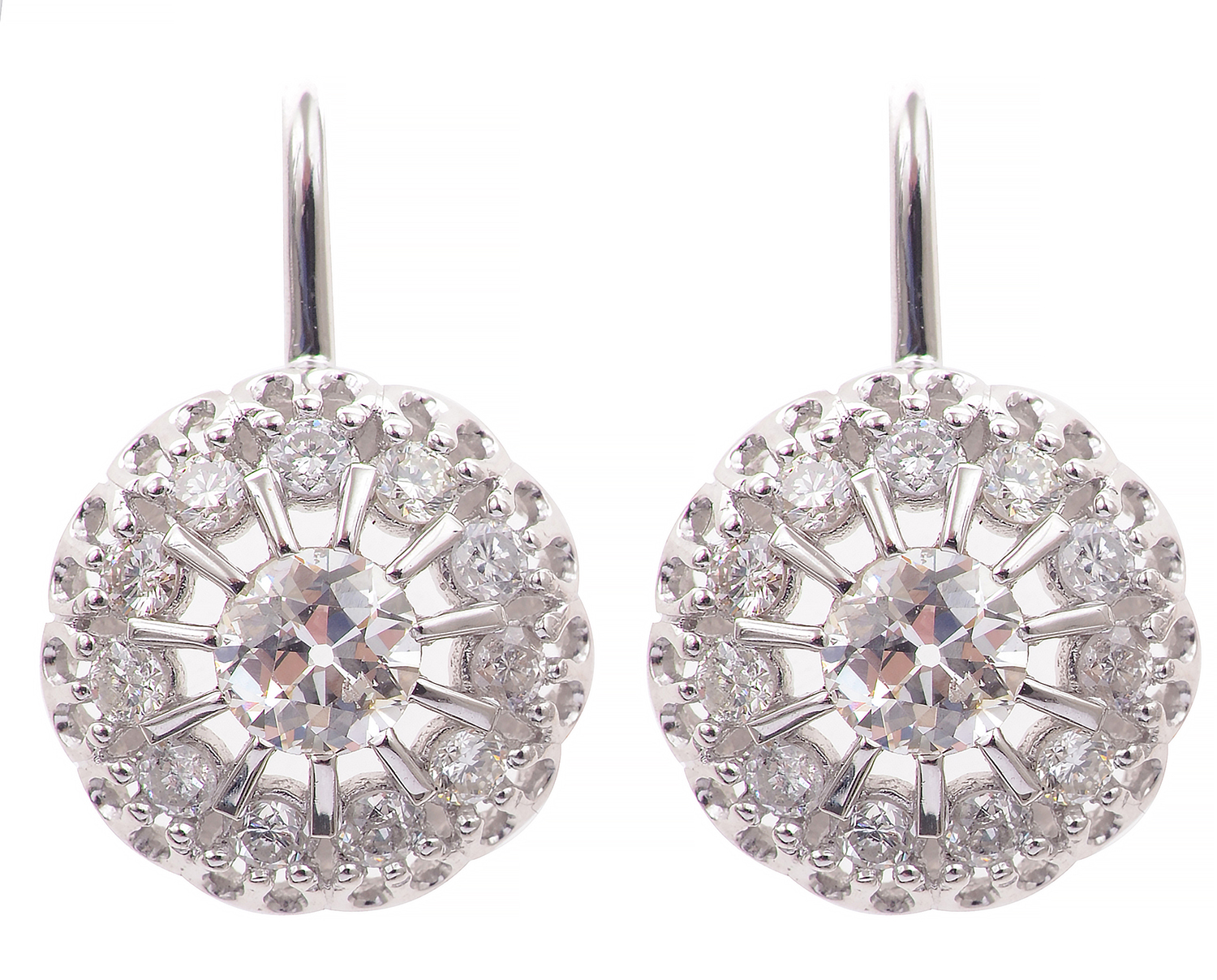 Earrings present in excellent condition and stones are secure in their settings. Principal diamonds are colour J, clarity SI2, smaller diamonds are colour H-J, clarity SI-P1. Having hook fittings.