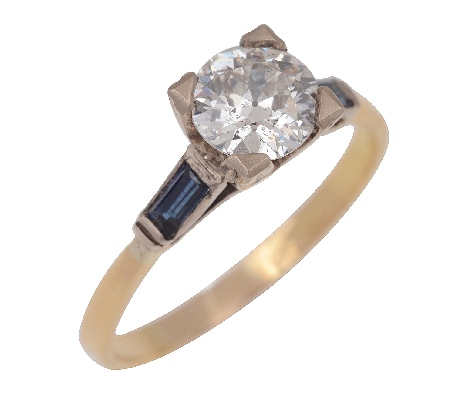 The early round brilliant cut diamond of 1.40cts, having baguette cut sapphires to the shoulders, mounted in two tone 18ct gold, ring size R.