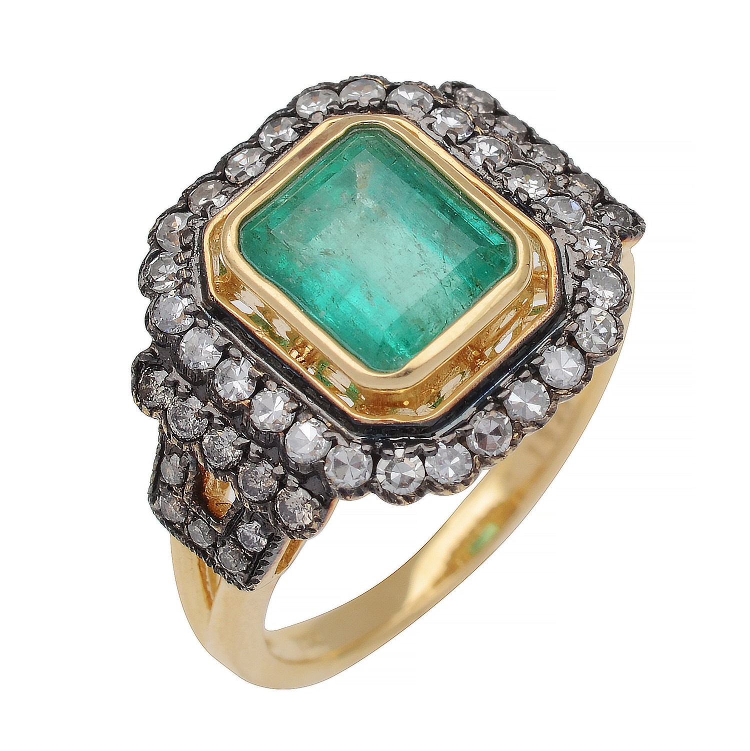The pierced plaque set with an emerald cut Colombian emerald of 1.80cts, surrounded by single cut diamonds totalling 0.62cts, mounted in 18ct gold, ring size L.