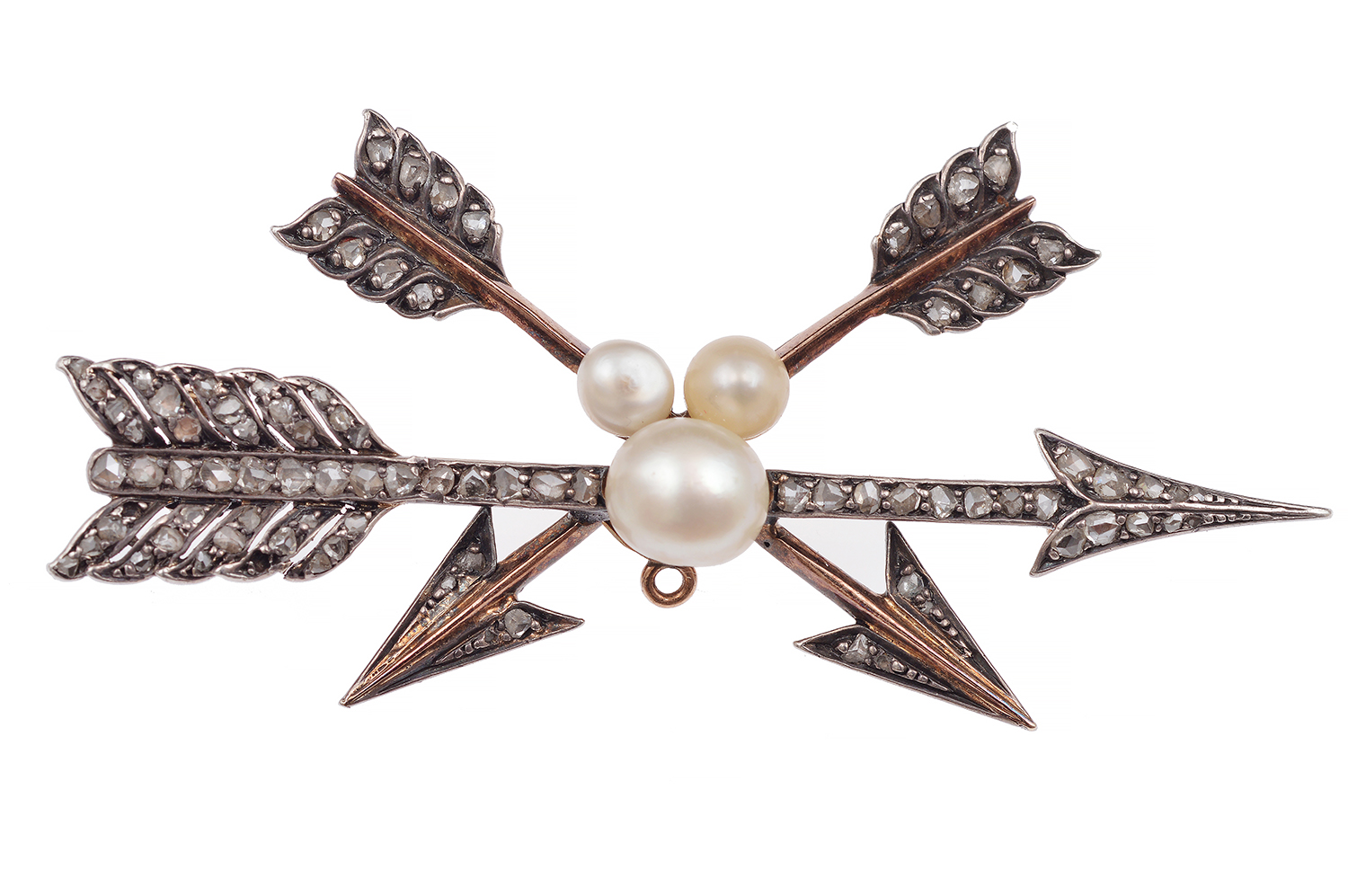 Modelled as three arrows in a crossover formation centred by three natural pearls, set throughout with rose cut diamonds, mounted in 18ct gold and silver.