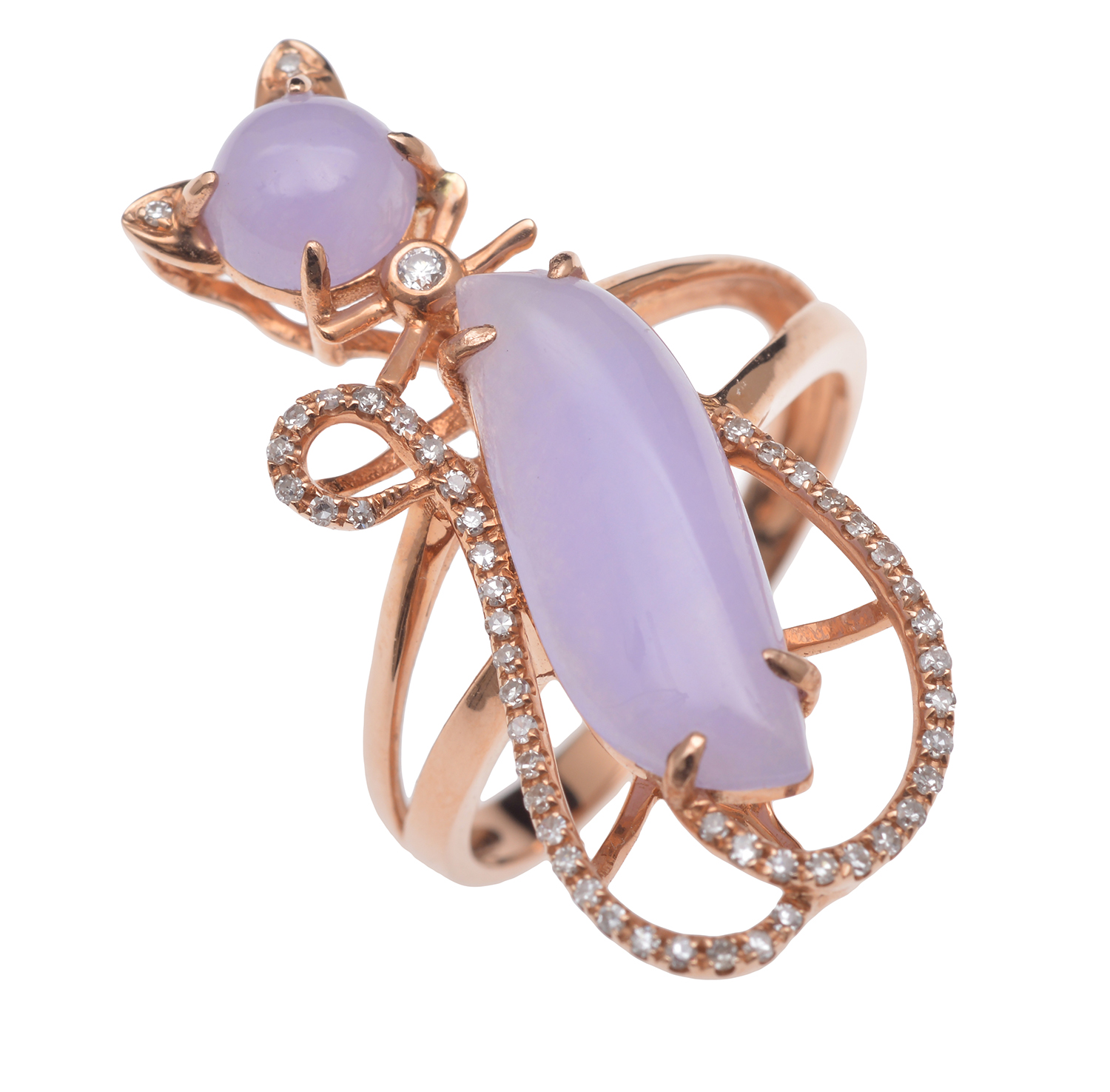 The stylised cat design, featuring two pieces of lavender jadeite, with diamond detail, mounted in 18ct rose gold, ring size M.