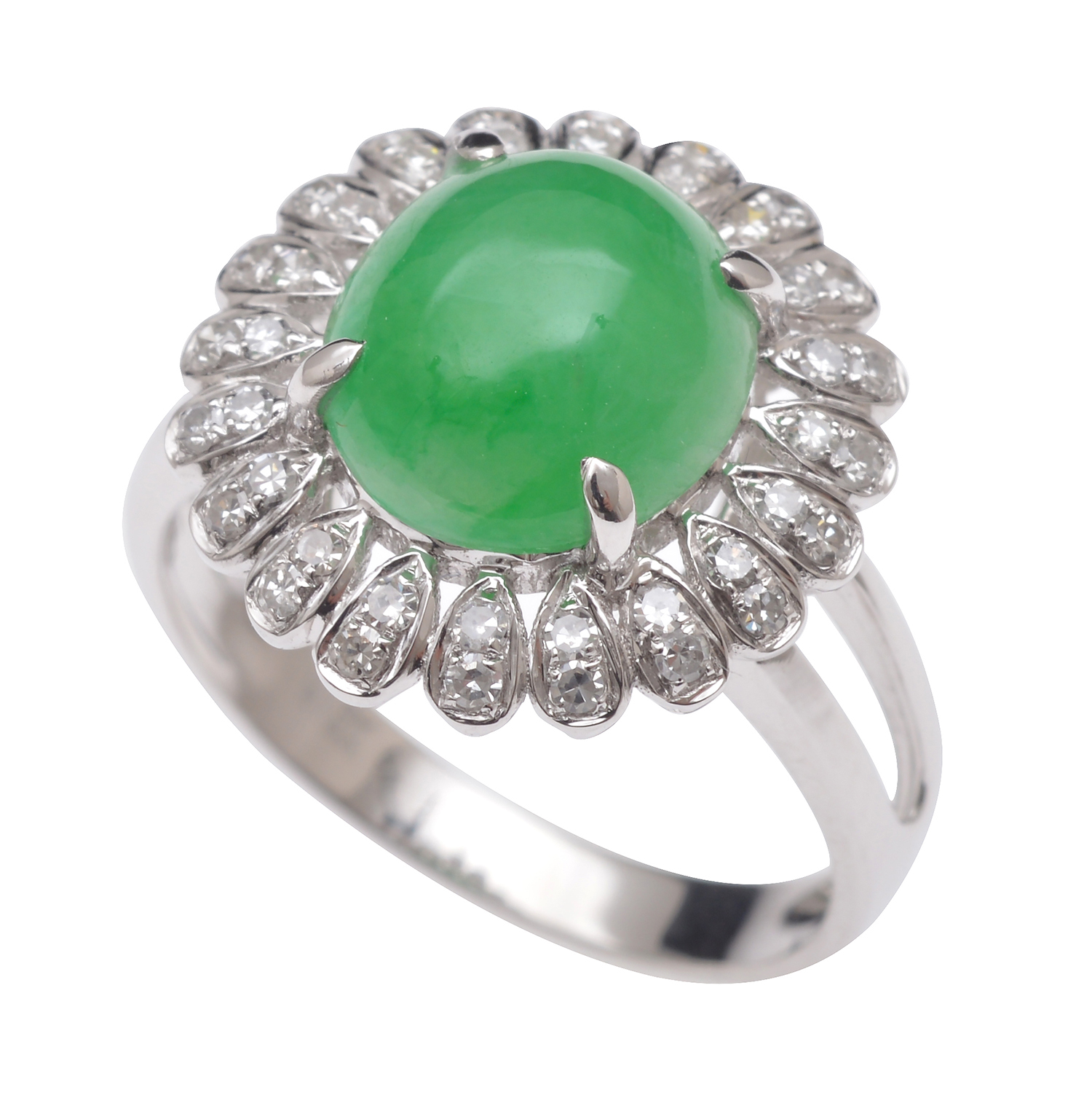 Comprising a central oval jadeite of green hues cut en cabochon, surrounded by single cut diamonds, mounted in 18ct white gold, ring size L.