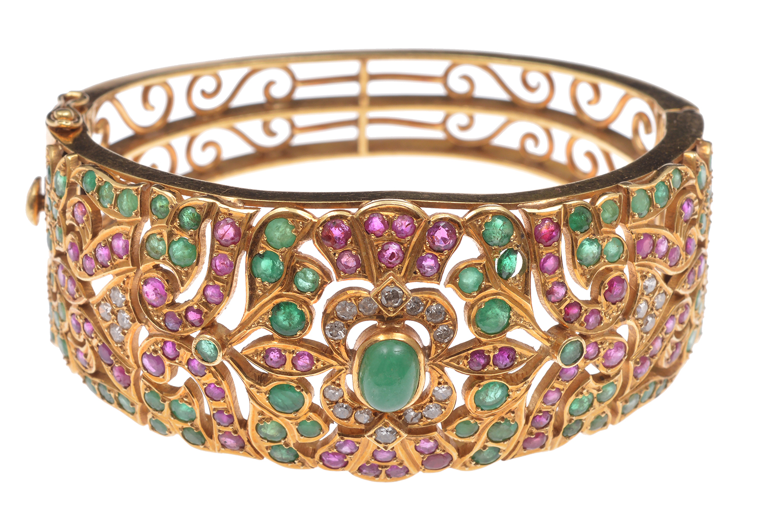 The oval pierced and hinged bangle of tapered design, set throughout with emeralds, rubies and diamonds, mounted in 18ct gold.