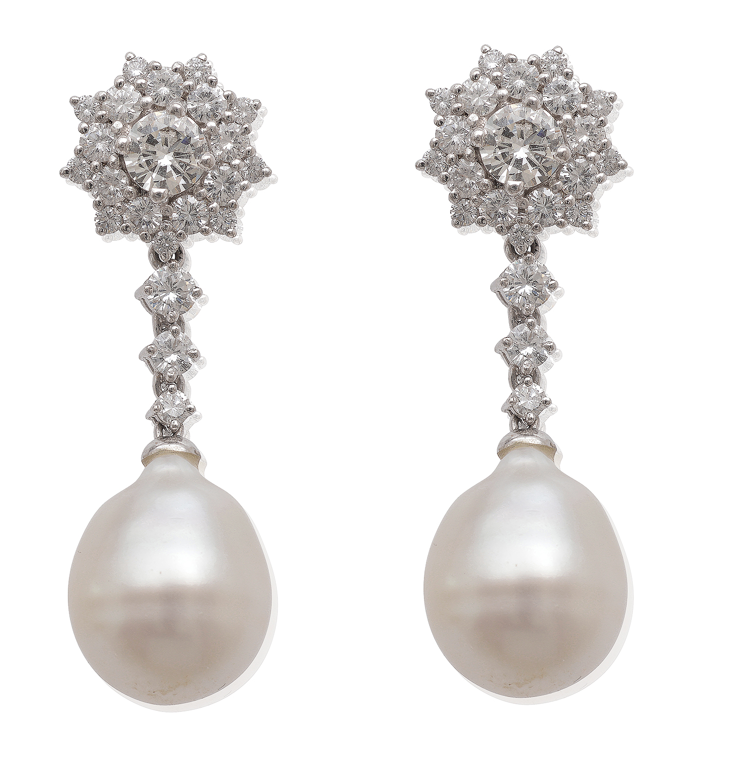 Each earring featuring a tear drop shaped pearl of cream and silver hue measuring 12.80mm x 14.65mm, surmounted by three round brilliant cut diamonds and suspended from a detachable diamond flower cluster panel, mounted in 18ct white gold.