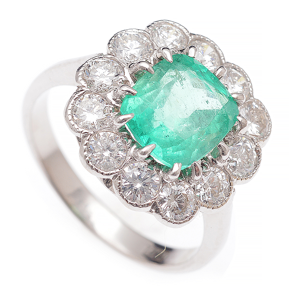 The cushion cut emerald of 2.00cts surrounded by round brilliant cut diamonds totalling 1.25cts, mounted in 18ct white gold, ring size L-M.