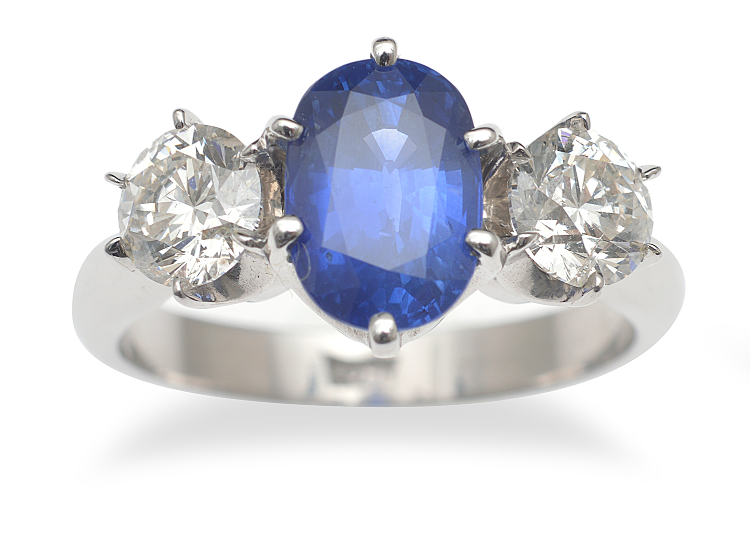Centrally set with an oval cut Ceylon blue sapphire of 2.50cts, shouldered by two round brilliant cut diamonds totalling 1.10cts, mounted in 18ct white gold, ring size M.