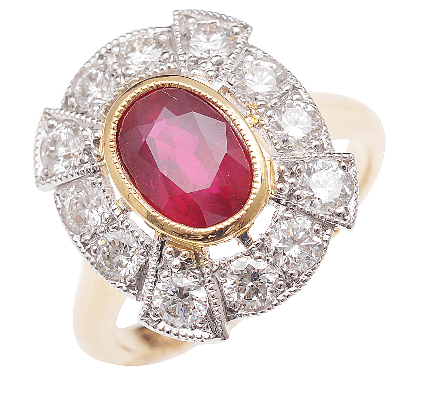 Centrally set with an oval cut ruby of 2.05cts, in a pierced plaque set with round brilliant cut diamonds totalling 1.00cts, mounted in 18ct gold, ring size M.