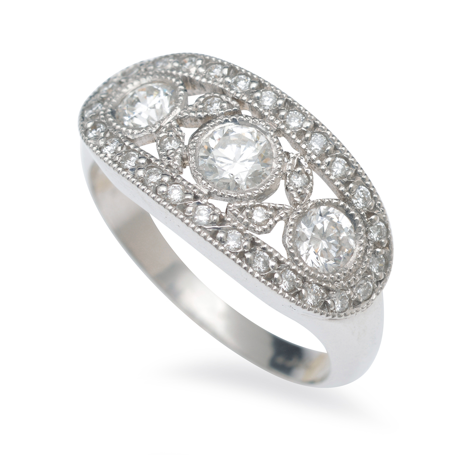 The pierced oval plaque set with three round brilliant cut diamonds totalling 0.84cts, having further diamond detail throughout, mounted in 18ct white gold, ring size M.
