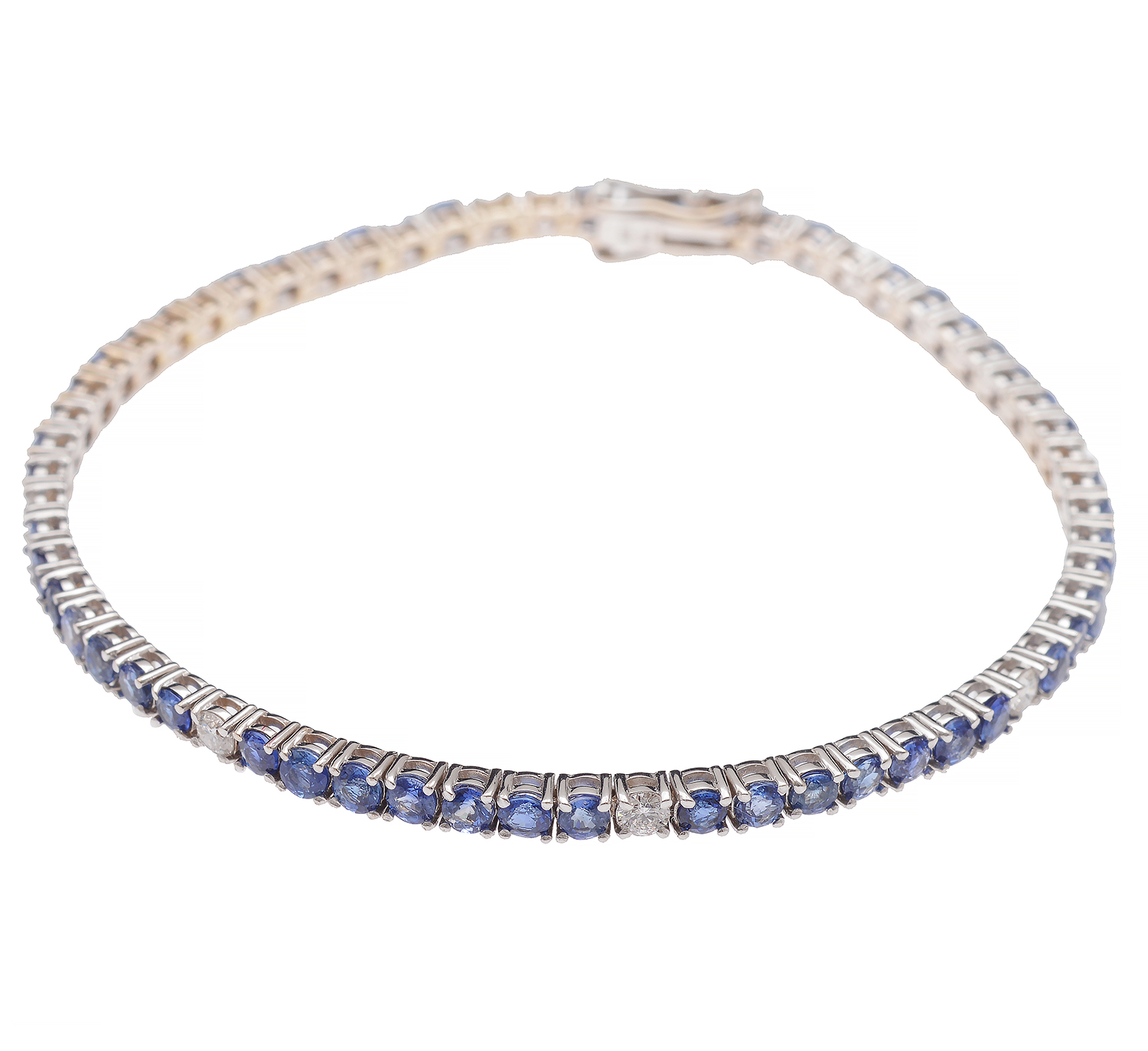 Featuring round cut sapphires totalling 6.15cts, interspaced by eight round brilliant cut diamonds totalling 0.58cts, mounted in 18ct white gold, total length 180mm.
