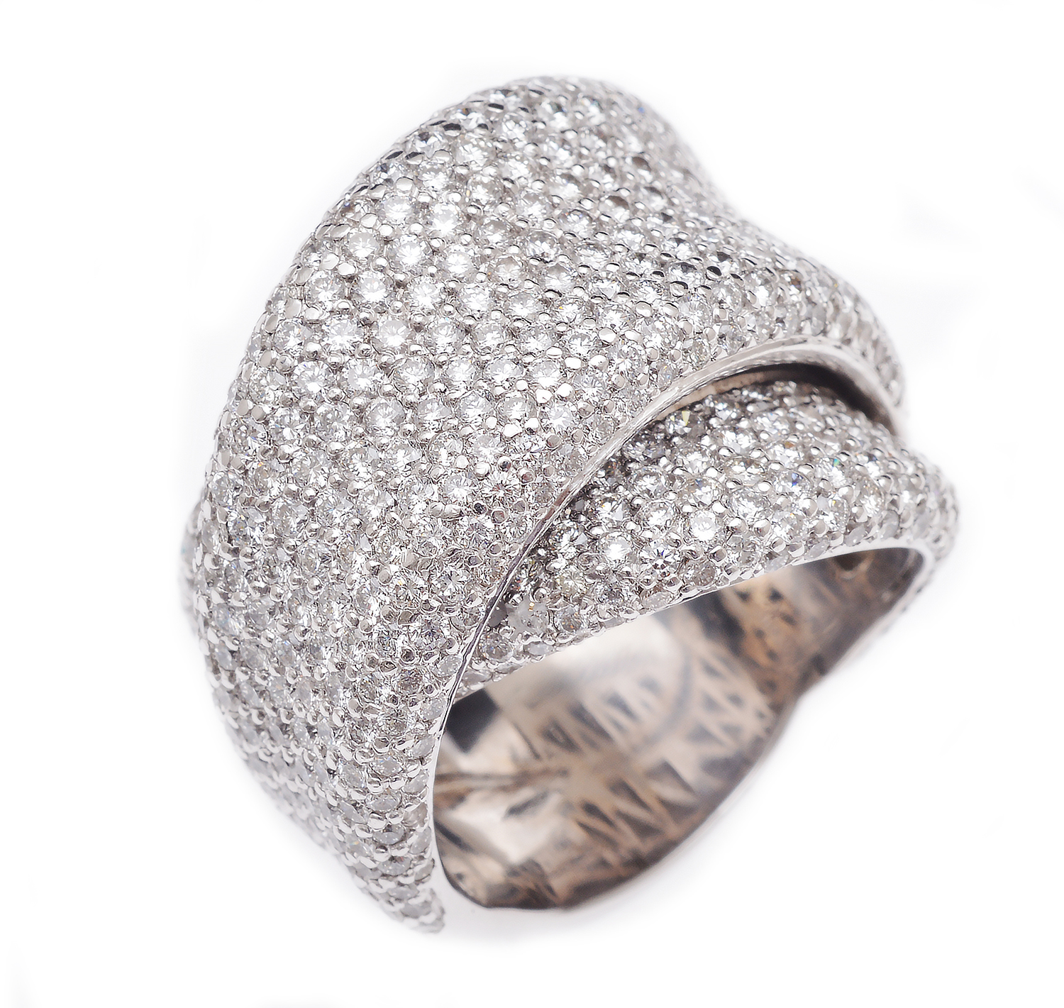 Of crossover design, pave set with round brilliant cut diamonds totalling 1.80cts, mounted in 18ct white gold, ring size N.