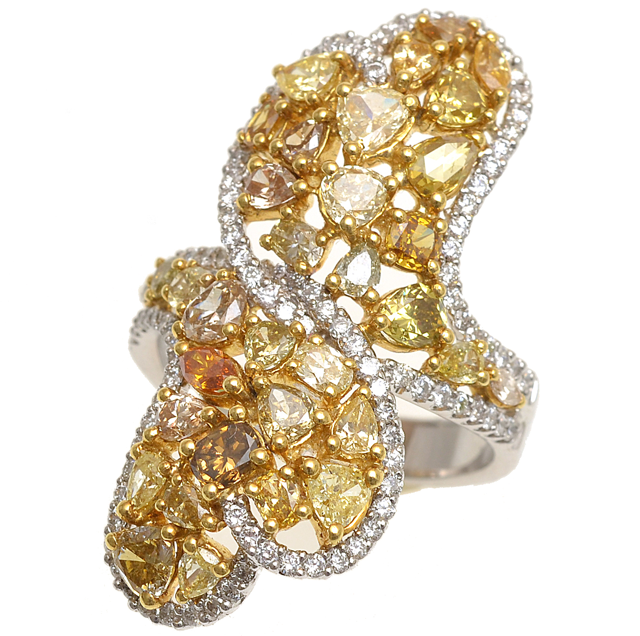 Featuring two curved heart shaped panels set with mixed cut yellow and champagne diamonds, finished with borders of round brilliant cut white diamonds, mounted in 18ct white gold, ring size M.