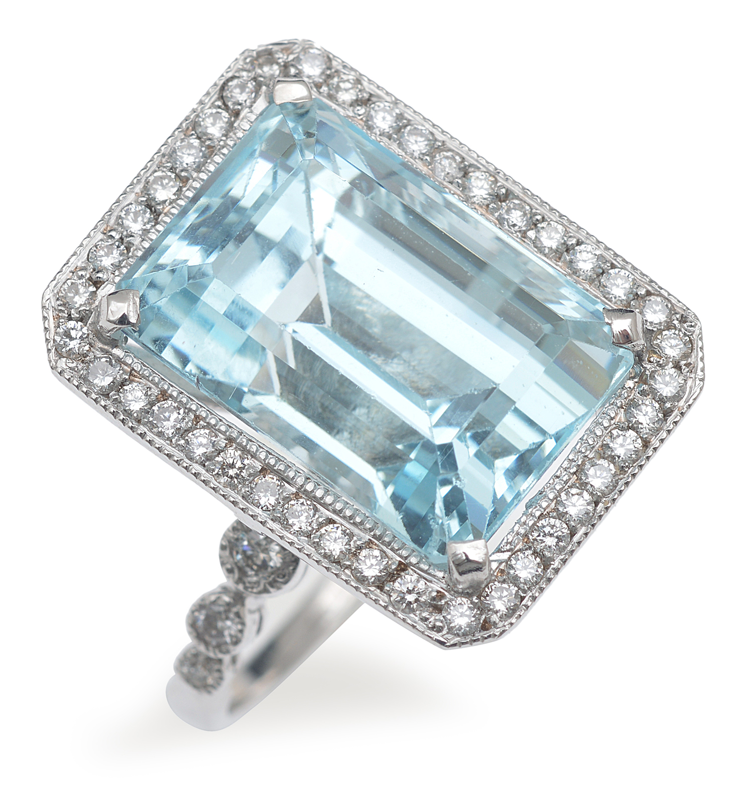 The emerald cut aquamarine of 10.40cts surrounded by round brilliant cut diamonds, mounted in 18ct white gold, ring size N.