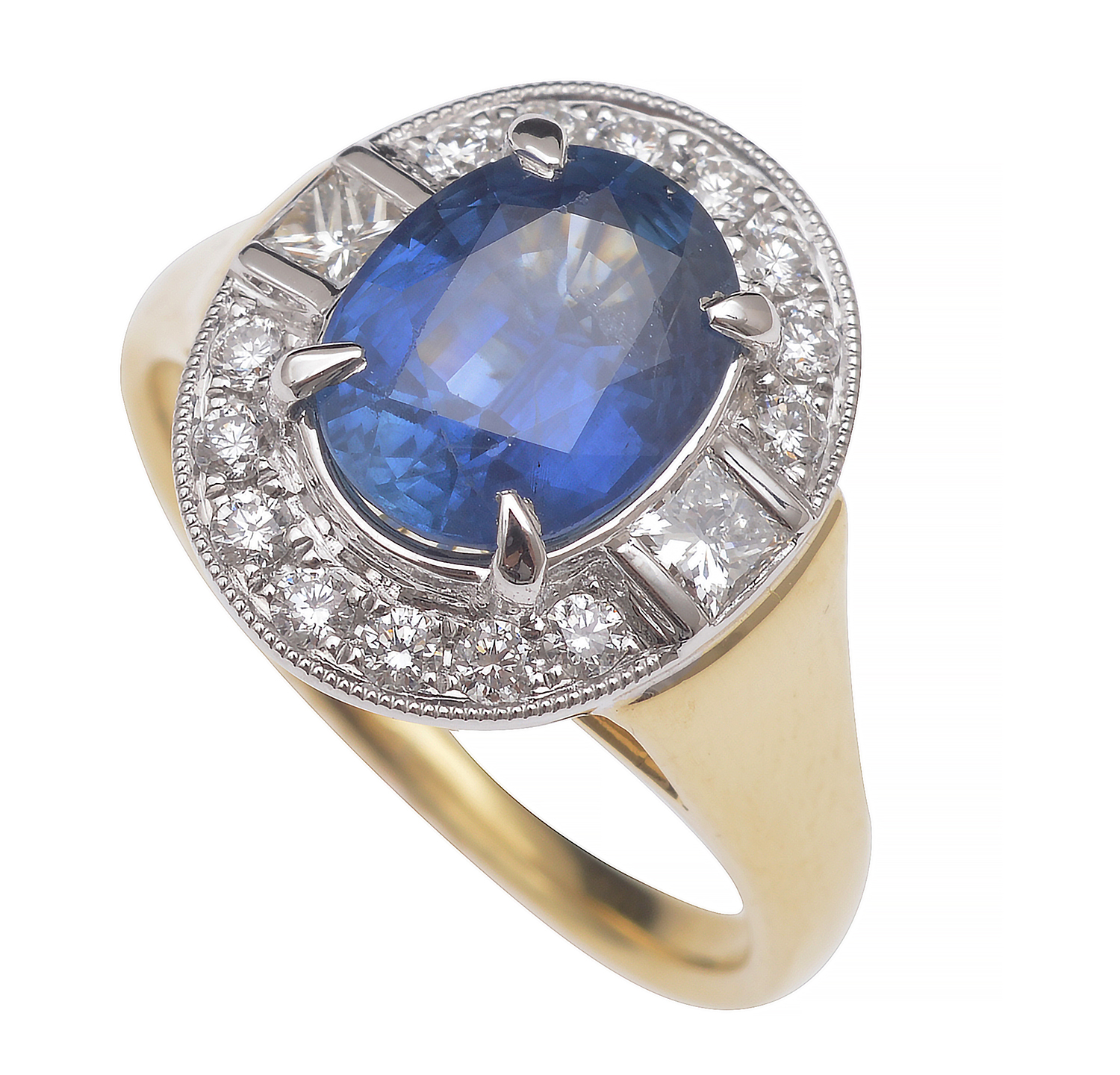 The oval cut sapphire of 2.35cts surrounded by round and princess cut diamonds, mounted in 18ct gold, ring size M.