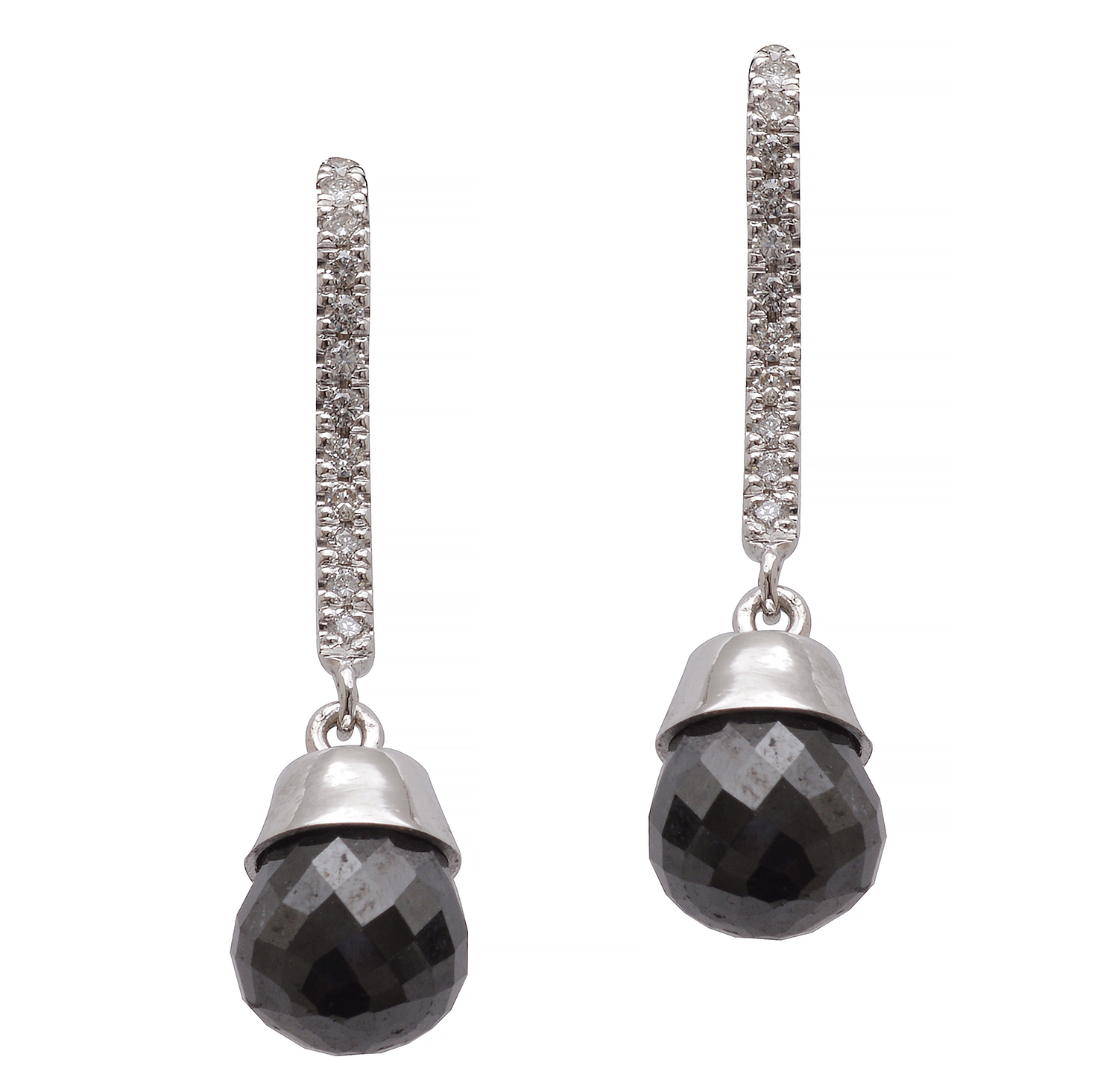 Each earring featuring a briolette cut black diamond surmounted by diamond set hook fittings, mounted in 18ct white gold.