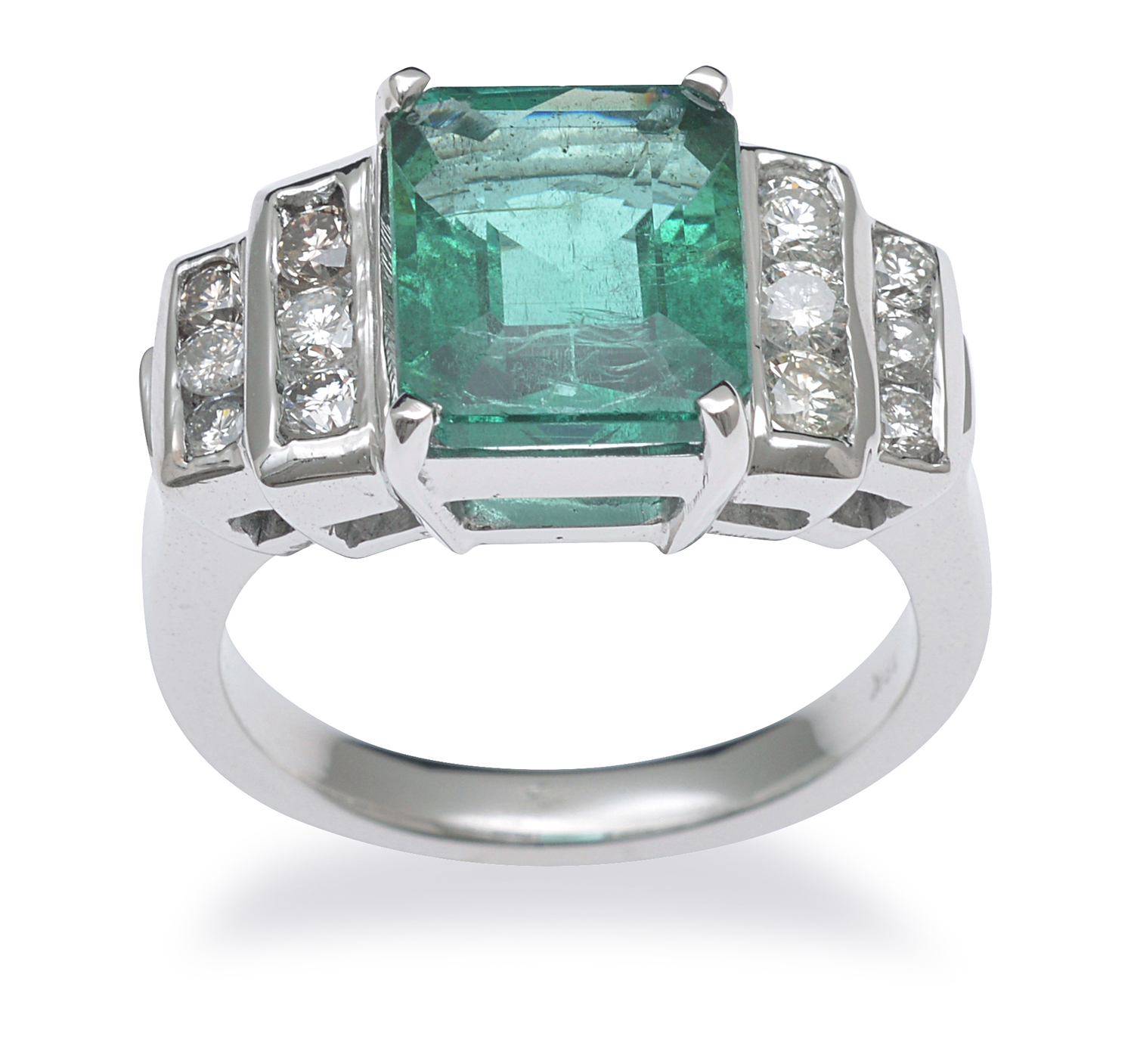 Centrally set with an emerald cut emerald of 2.72cts, having stepped shoulders set with round brilliant cut diamonds, mounted in 18ct white gold, ring size L.