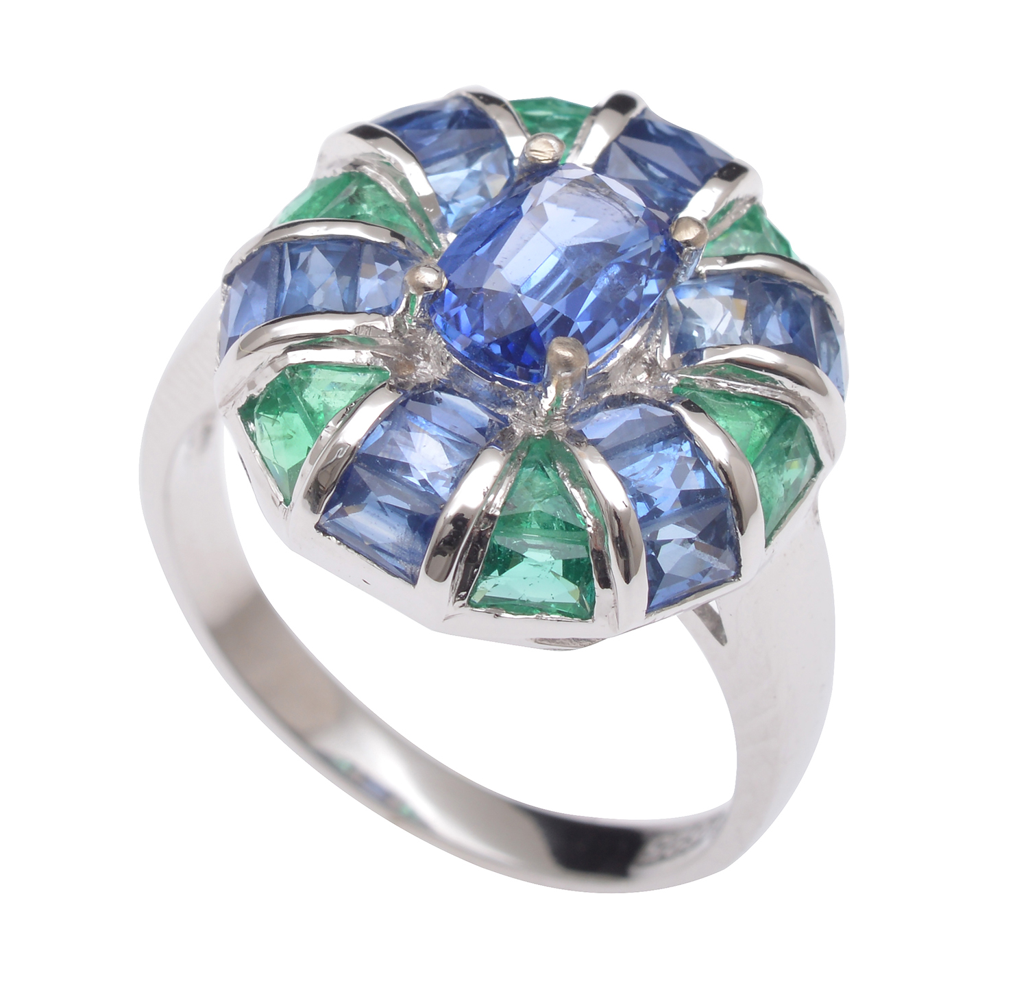 A SAPPHIRE AND EMERALD CLUSTER RING