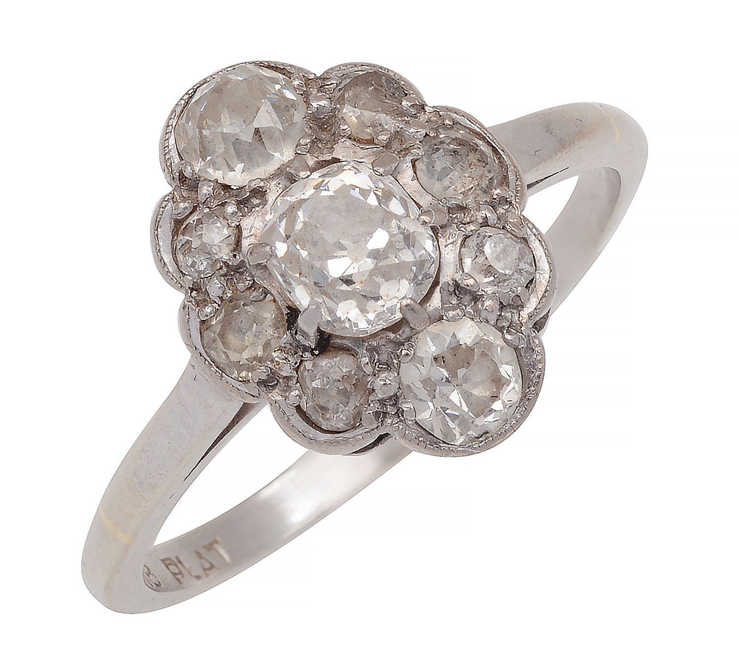 Centrally set with an old European cut diamond of 0.40cts surrounded by further diamonds, mounted in platinum and 18ct white gold, ring size O.
