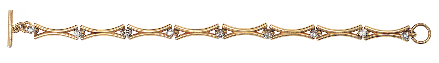 The elongated concave links interspaced with nine round brilliant cut diamonds totalling 0.50cts, mounted in 18ct gold, total length 205mm.