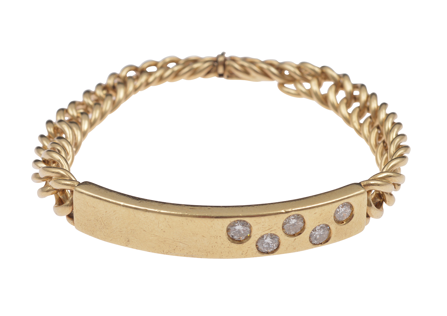 Featuring a curved panel offset with five round brilliant cut diamonds totalling 1.20cts, finished with flat curb link chain, mounted in 18ct gold, total length 185mm.