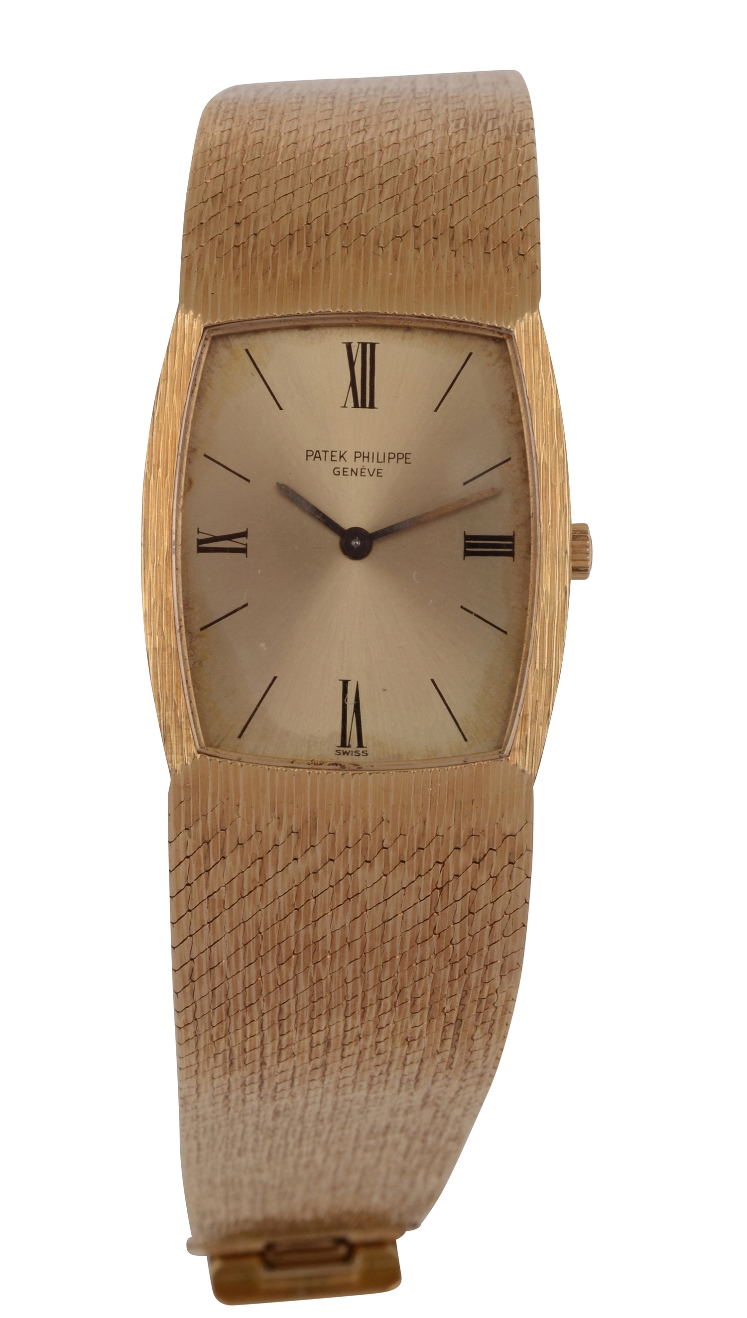Manual wind movement, tonneau shaped gilded dial with Roman numerals, signed case, dial and movement, 18ct gold case with integral bracelet bands, movement number 1167232, case number 2705457/3528-3, total length 190mm, case length 25mm.