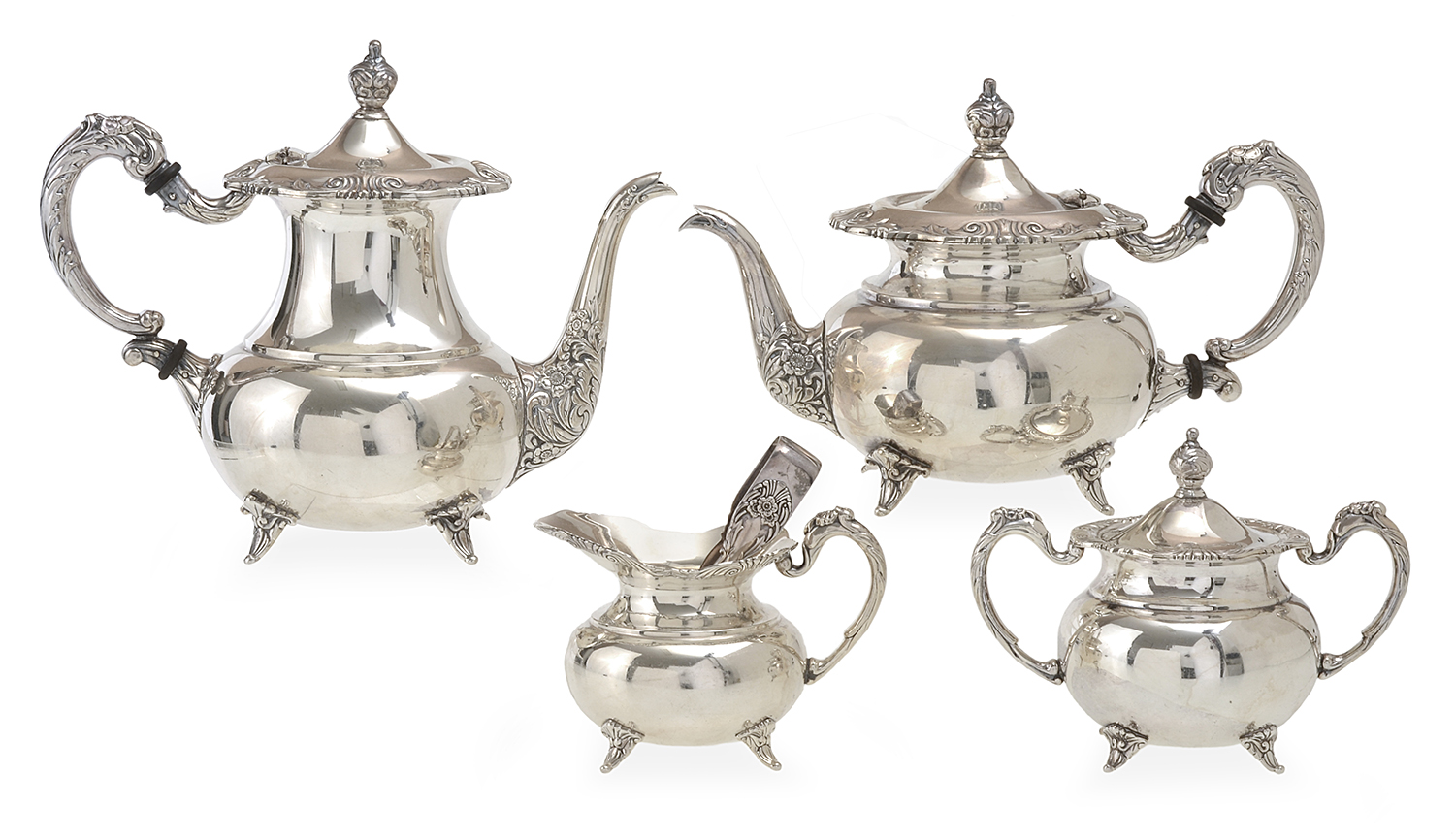each piece compressed in form, with a scrolled acanthus leaf border, on four feet, accompanied by a matched pair of sugar tongs, housed in fitted suitcase, total weight approximately 2310 gms, the coffee pot 22cm high