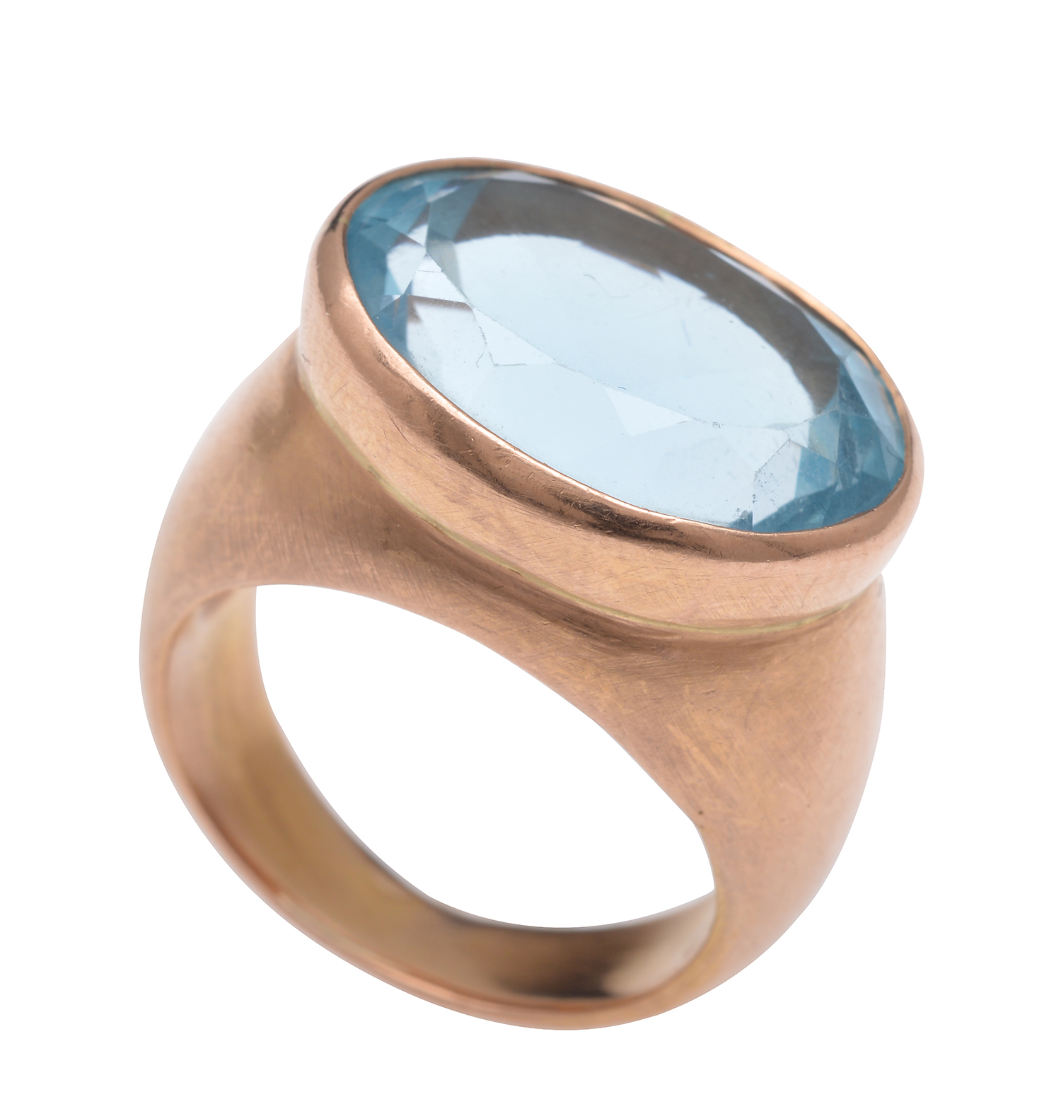 The fancy cut oval blue topaz of 15.20cts, bezel set horizontally, mounted in 18ct rose gold, ring size M.