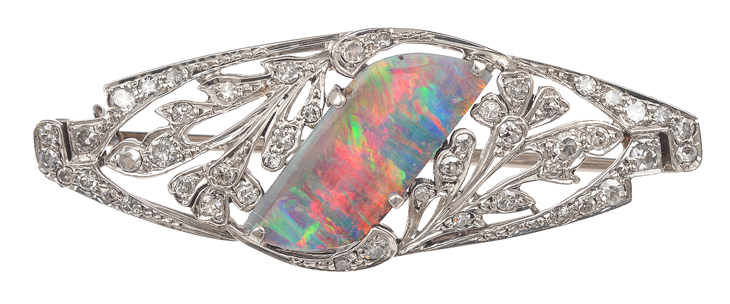 Centrally set with a free form polished boulder opal in a pierced foliate frame set with mixed cut diamonds, mounted in platinum.