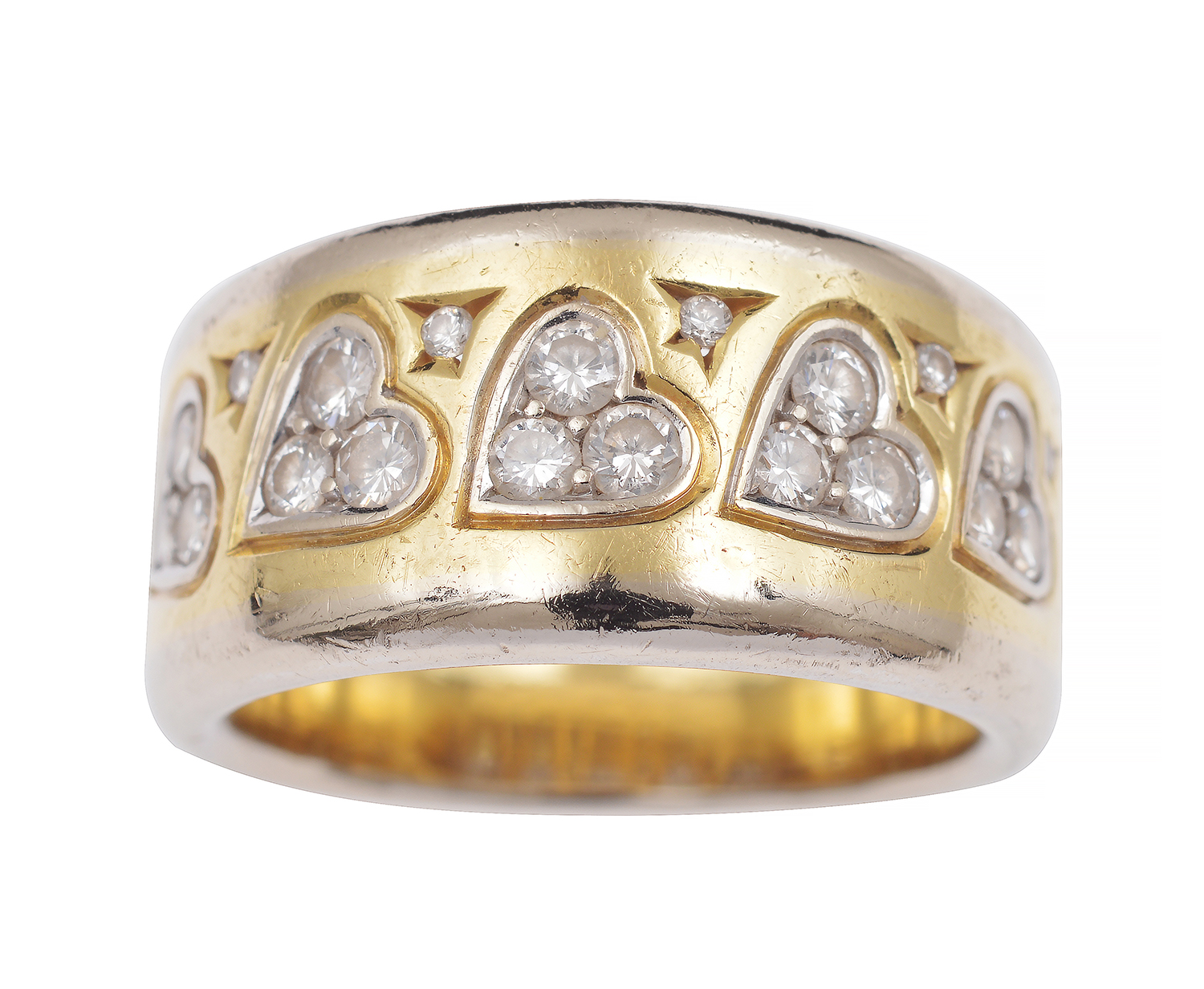 Featuring five heart panels set with a trefoil of diamonds and further diamond detail set throughout, mounted in 18ct gold, ring size O.