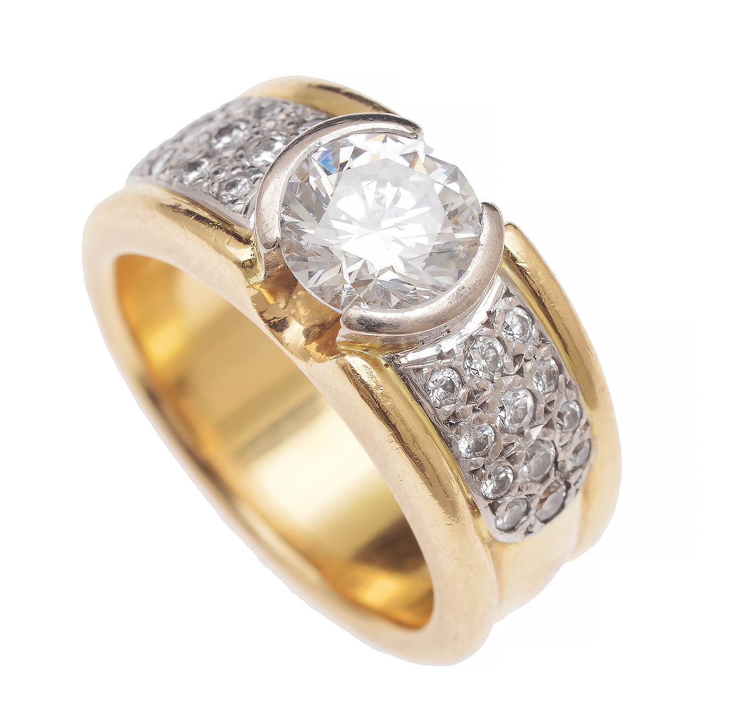 Ring presents in good condition. Stones are secure in their setting. Some surface wear to base of shank. Principal diamond is colour G, clarity SI1, smaller diamonds are colour G. clarity VS-SI.