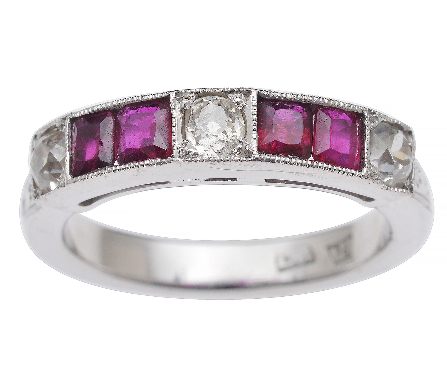 Comprising three old European cut diamonds interspaced with four carre cut rubies, mounted in 18ct white gold, ring size L.