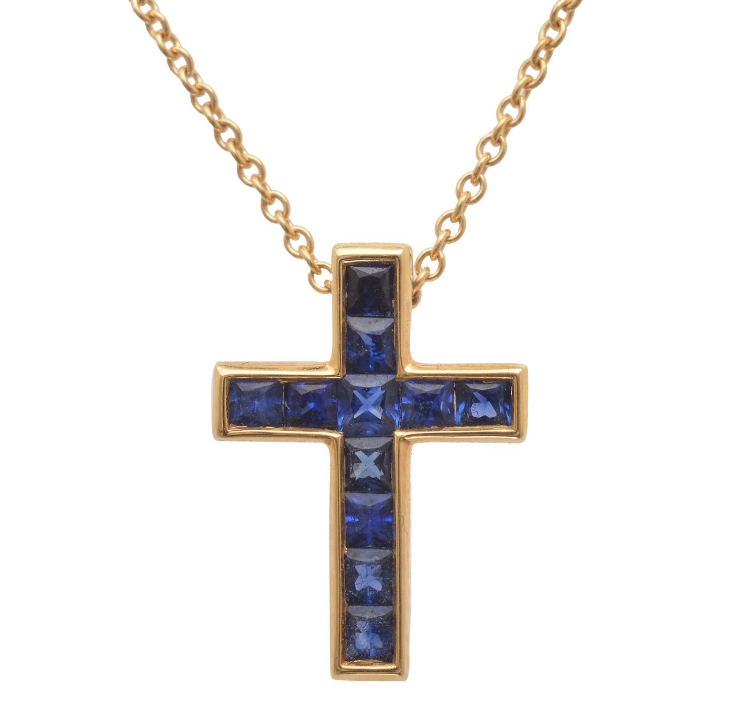 Set with eleven carre cut sapphires and suspended from a trace chain, all in 18ct gold, total length 420mm.