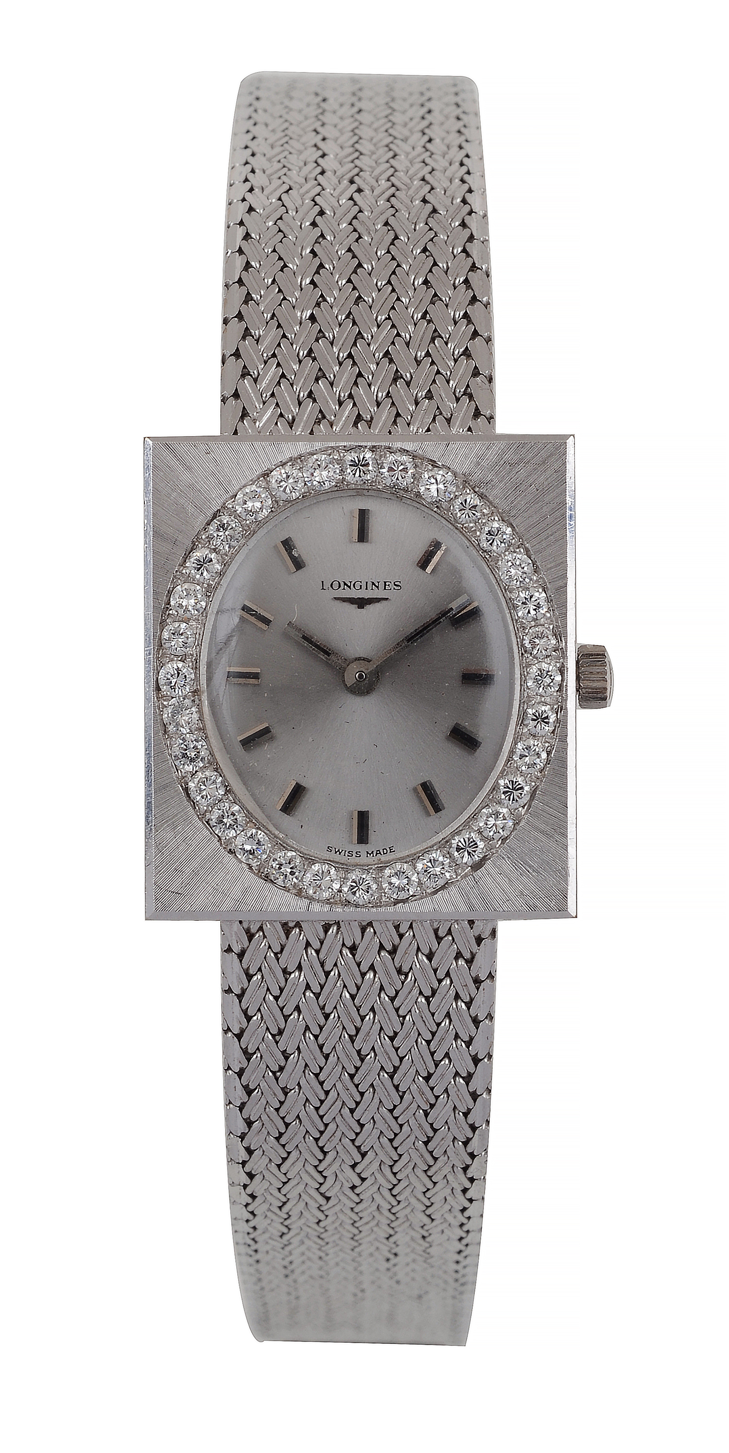 Manual wind movement, oval silvered dial with baton numerals, signed case, dial and movement, rectangular 18ct white gold case with diamond set bezel and bracelet bands, total length 160mm, case length 25mm.