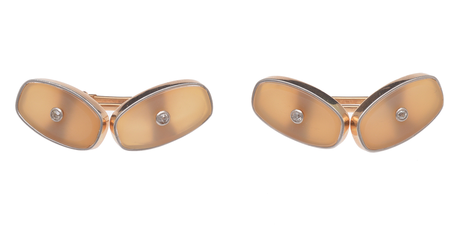 The double ended cufflinks each comprising a fancy cut panel of agate, centrally set with an old cut diamond, mounted in 18ct gold and platinum.