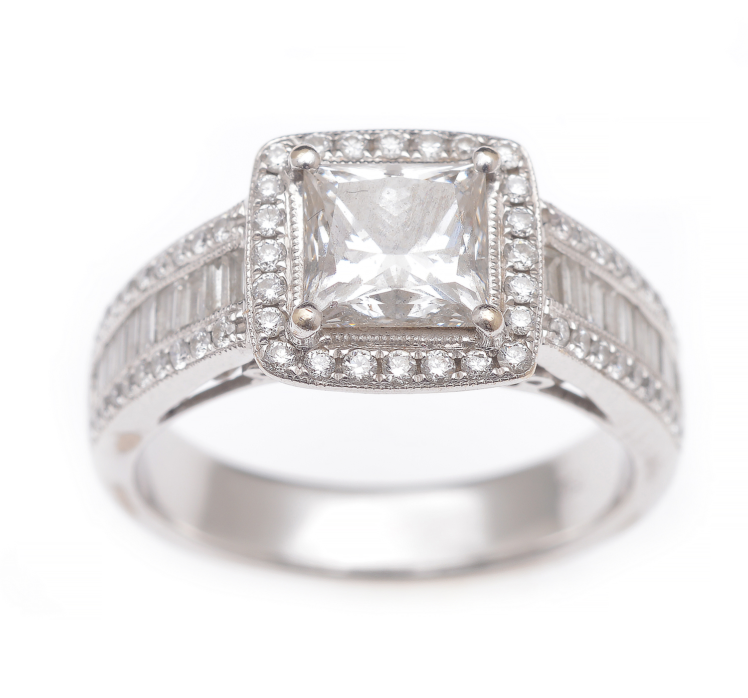 Centrally set with a princess cut diamond of 1.51cts, accompanied by a GIA certificate stating colour D, clarity SI1. surrounded by round brilliant cut diamonds with further diamond detail to the shoulders, mounted in 18ct white gold, ring size N,