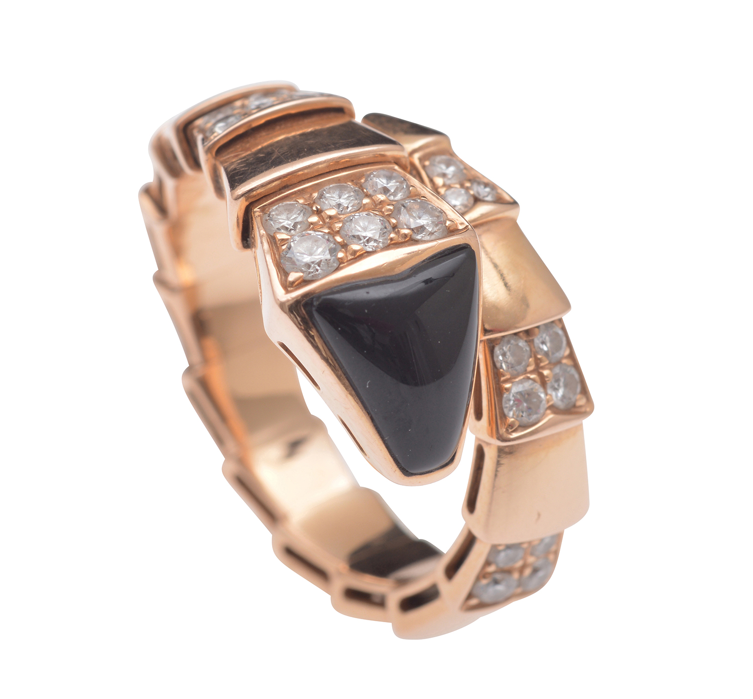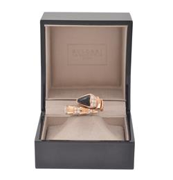Featuring an onyx set head with round brilliant cut diamonds set throughout to the coiled body, signed, mounted in 18ct rose gold, ring size N, boxed.