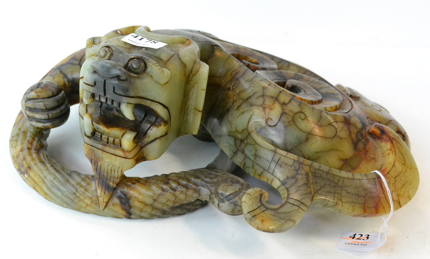 modelled in a crouched position, with the long tail curling around the body, the stone with russet inclusions 26.5 cm wide