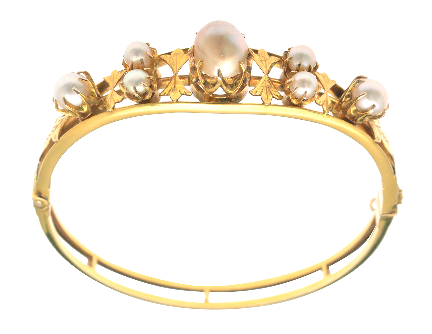 Bangle presents in very good condition. Pearls are of varying hues and one pearl has some crazing. Fitted with a safety chain.