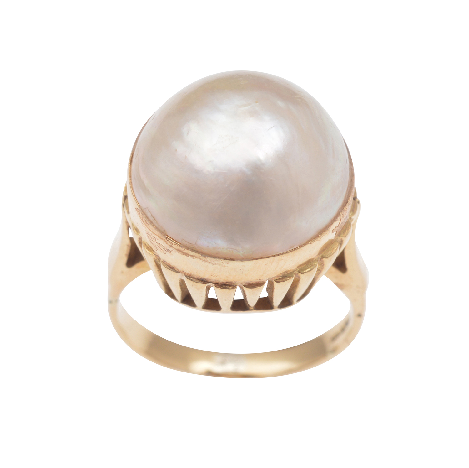 The baroque pearl of cream and pink hues measuring 16.5mm, mounted in a heavy frame of 18ct gold, ring size M.