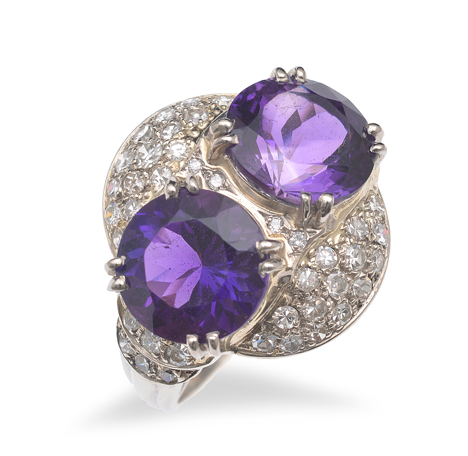 Featuring two round amethysts totalling 6.80cts framed by single cut diamonds to the surround and stepped shoulders, mounted in 14ct white gold, ring size Q-R.