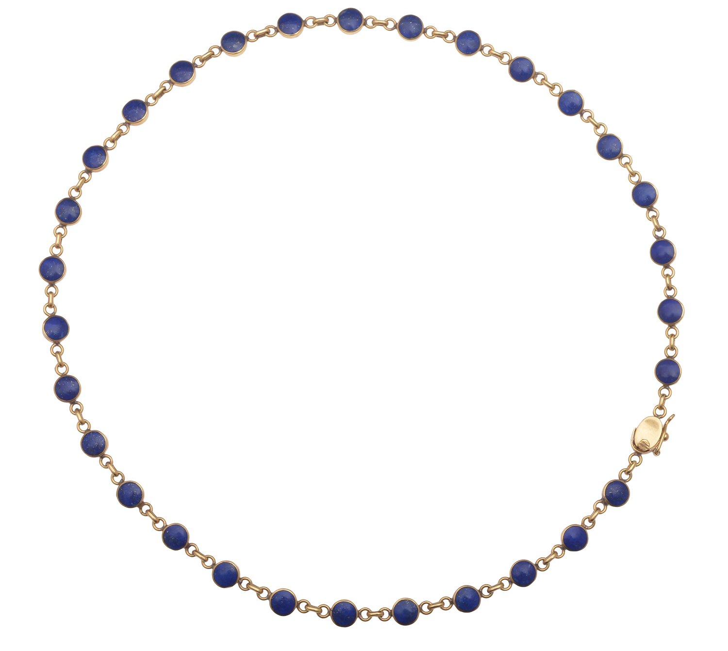 Featuring circular panels of lapis lazuli interspaced with belcher link chain, mounted in 18ct gold, total length 500mm.
