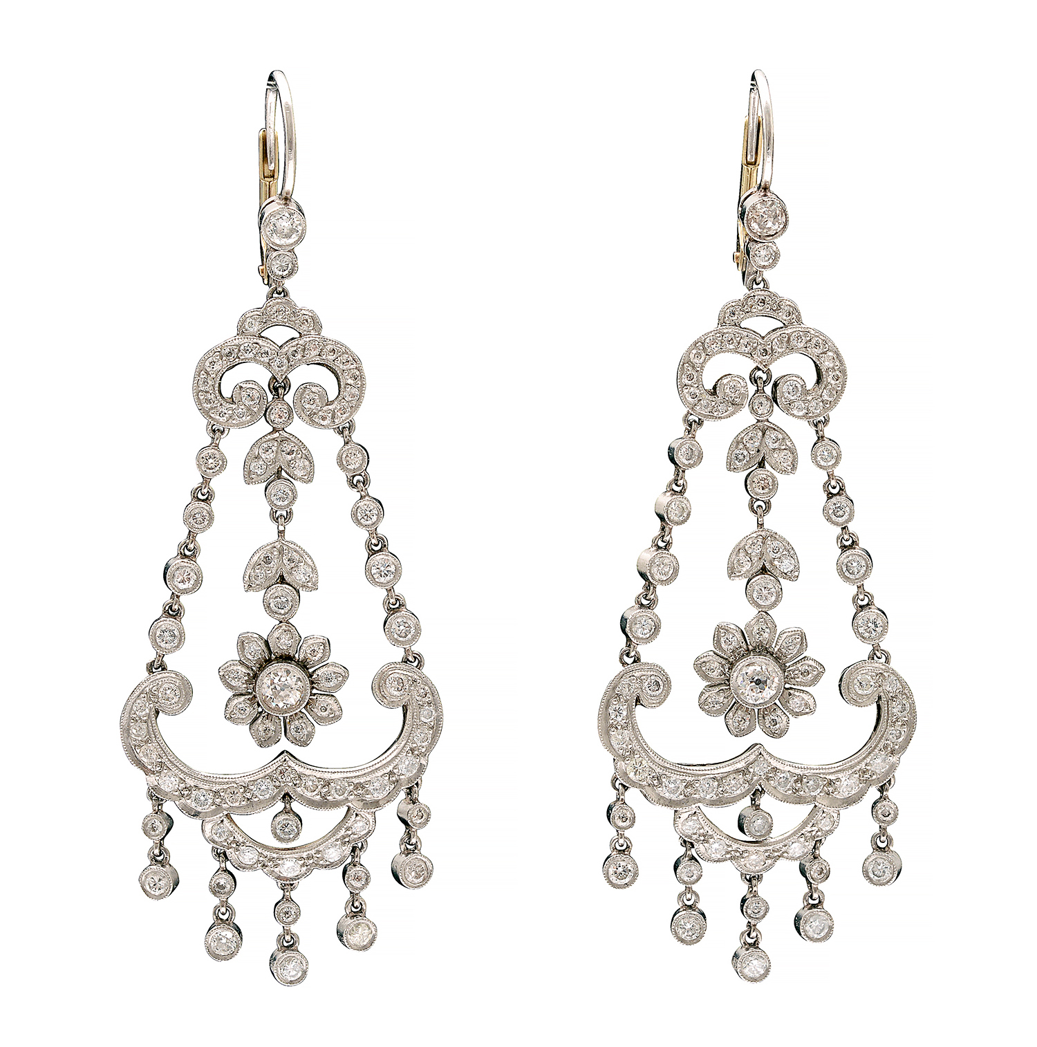 Earrings presents in good condition. The setting is all platinum with the exception of a later addition of a clip fitting to insure the earring are secure when on. Fittings are continental hooks which have been altered from the original. Diamonds are well matched colour H-J, clarity SI, total drop 65mm.