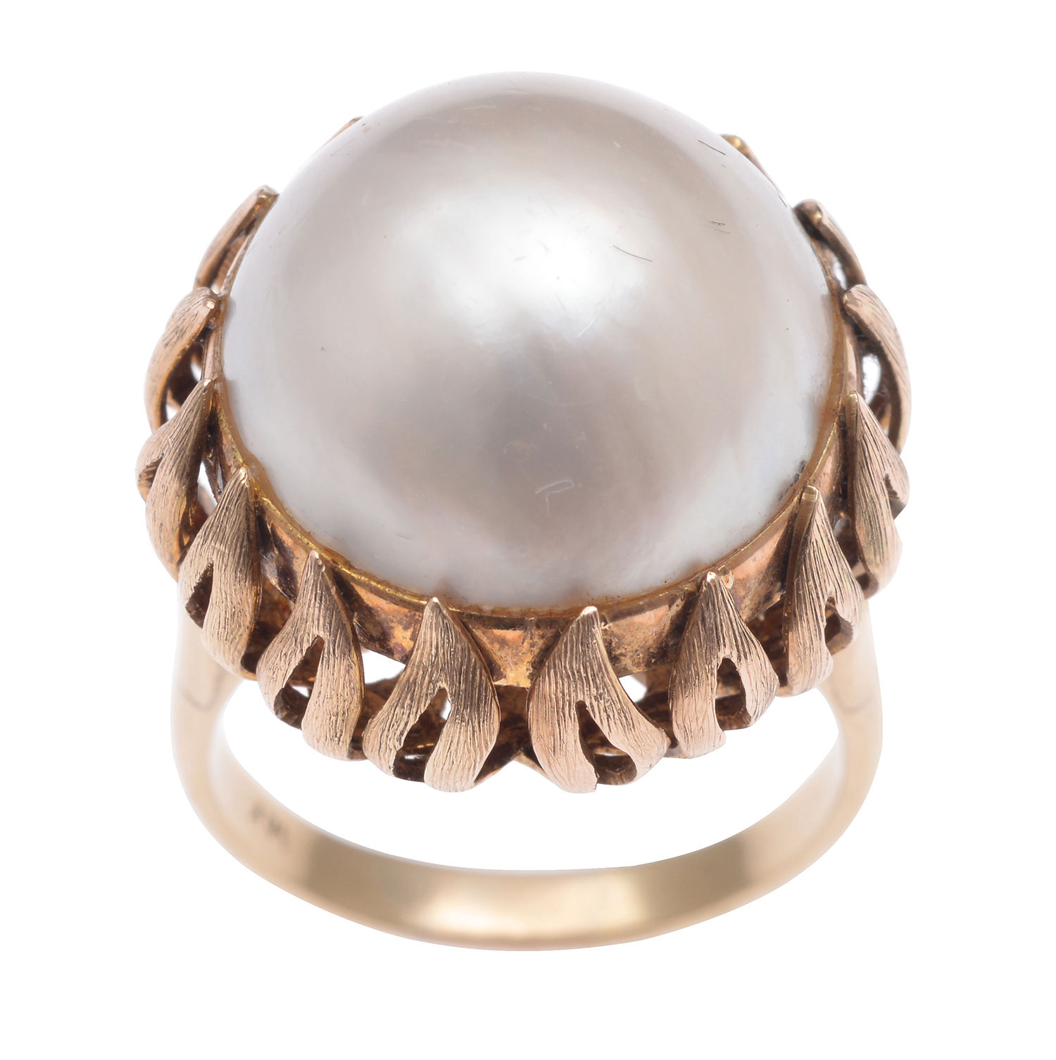 The half round pearl of silver and white hues measuring 17.3mm, set in a pierced basket of textured leaves, mounted in 14ct gold, ring size Q.